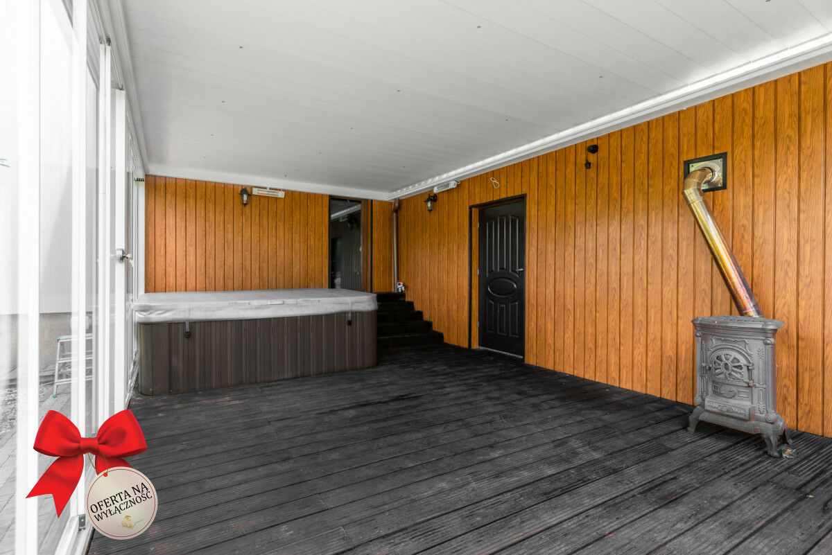 - łazienka z wc o pow. 5,73m2 (prysznic) z wyjściem na zadaszony taras z jacuzzi (tarasola, szyby przesuwne, jacuzzi, koza),
